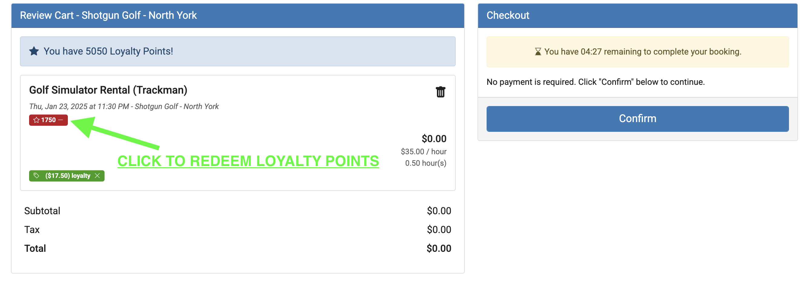 During checkout, select the option to apply your Shotgun Rewards Points towards your booking, then click Confirm.